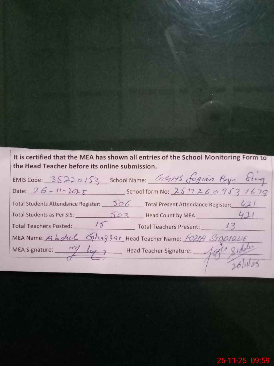 | Remarks (Use Separate Page if Required): PET Saira Fatima absent since Feb 2025 NSB available amount 751987 but last head teacher not used so school required maintenance ,white wash,teacher furniture and furniture for 150 students NSB and ftf BANK count not functional 35220153 | |||||