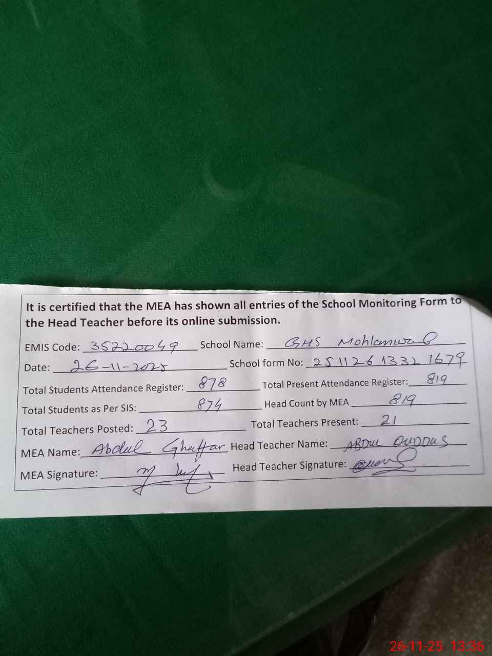 | EMIS Code: 35220049 | Name of School: GHS MOHLANWAL LAHORE | |||