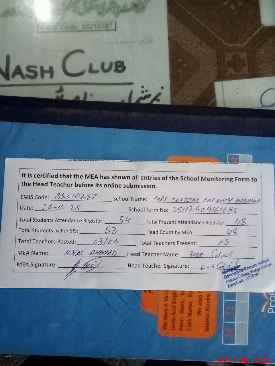 | EMIS Code: 35210287 | Name of School: GPS CUSTOM COLONY WAHGA | |||