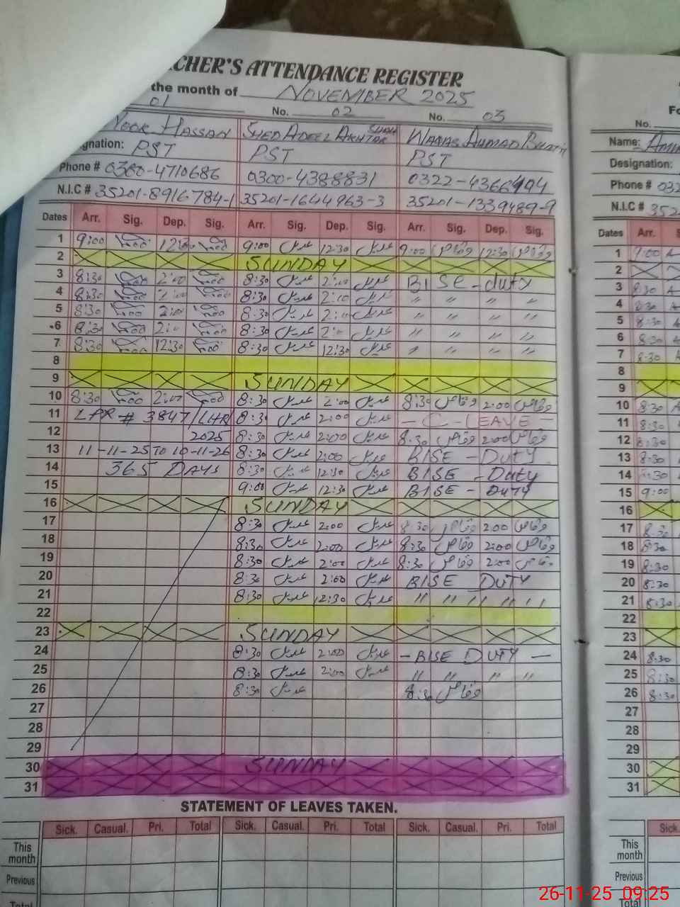 | CNIC | Full Name | Designation | R/C | Absence During Last Calender Month |