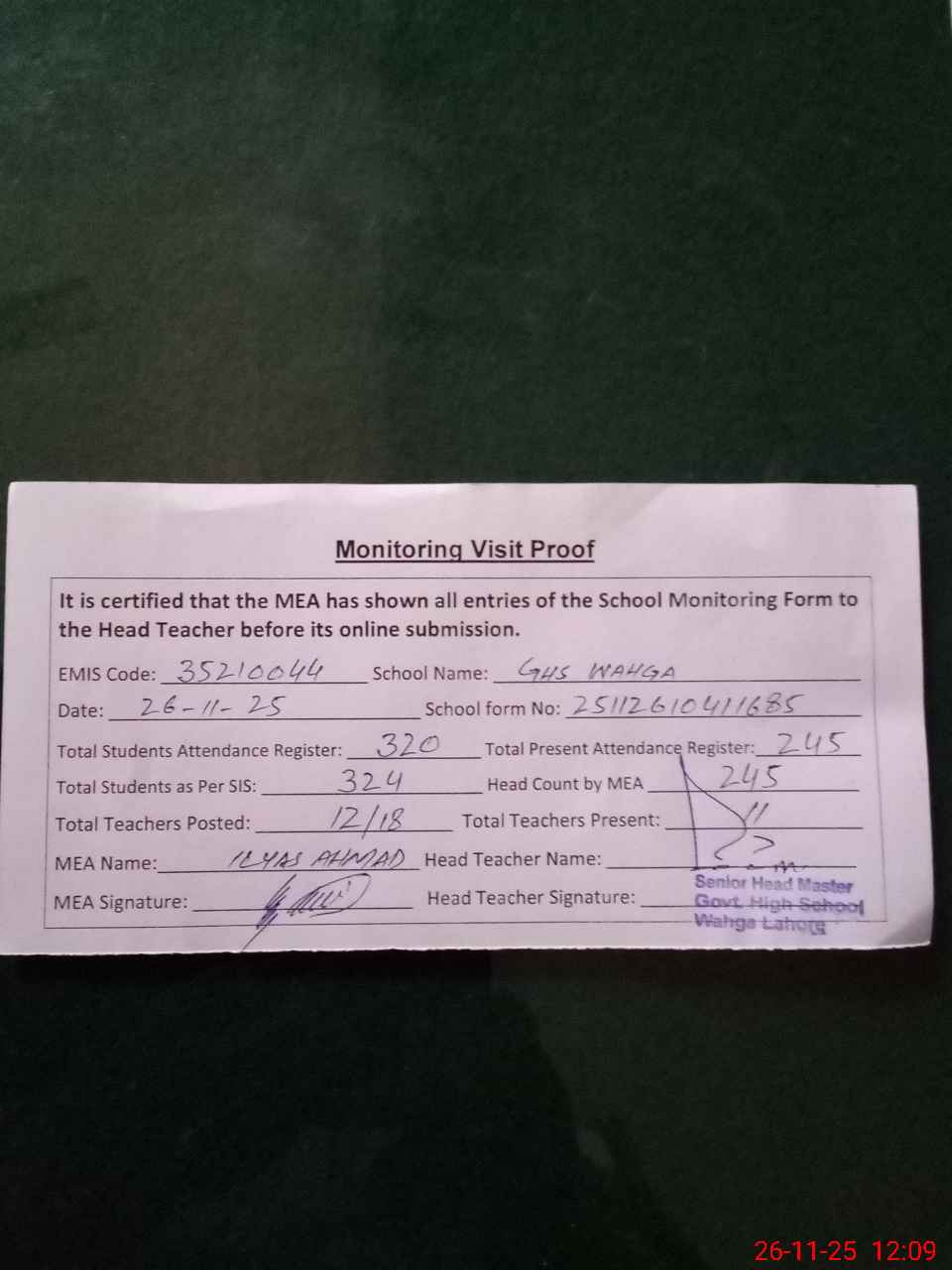 | Attendance Register | Head Teacher | MEA with School | Visit Proof |