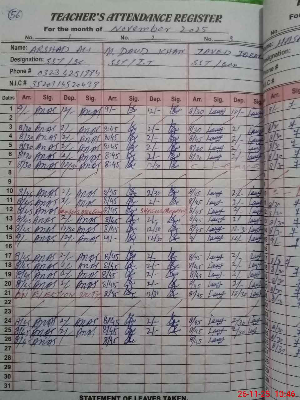 | CNIC | Full Name | Designation | R/C | Absence During Last Calender Month |