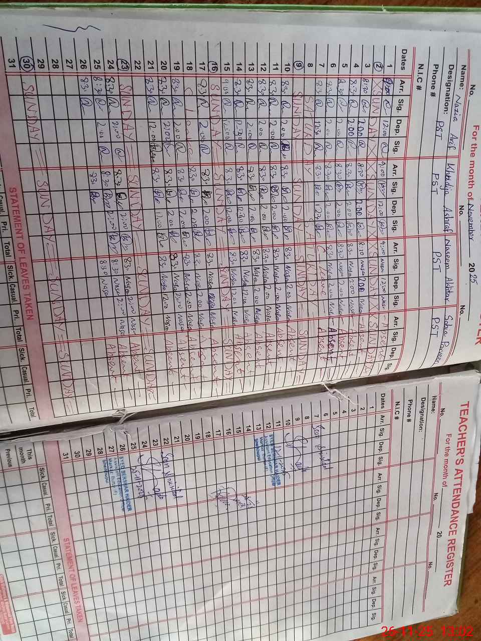 | CNIC | Full Name | Designation | R/C | Absence During Last Calender Month |