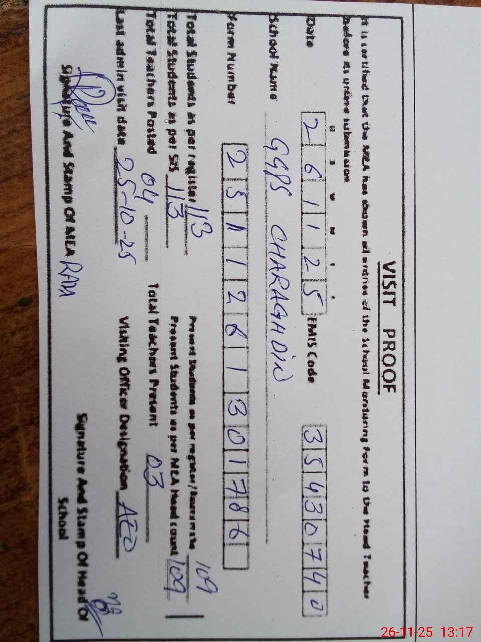 | Attendance Register | Head Teacher | MEA with School | Visit Proof |