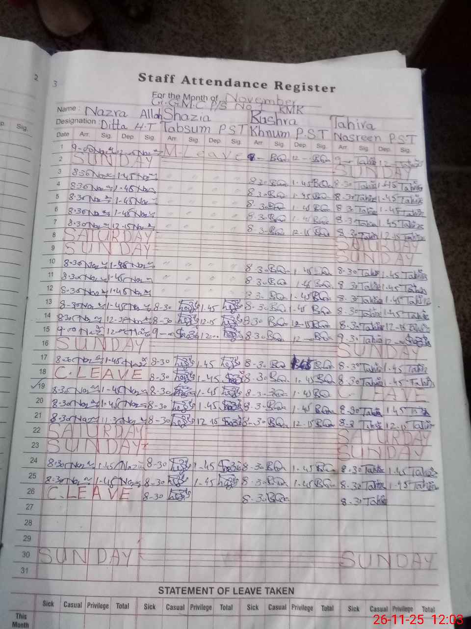 | CNIC | Full Name | Designation | R/C | Absence During Last Calender Month |
