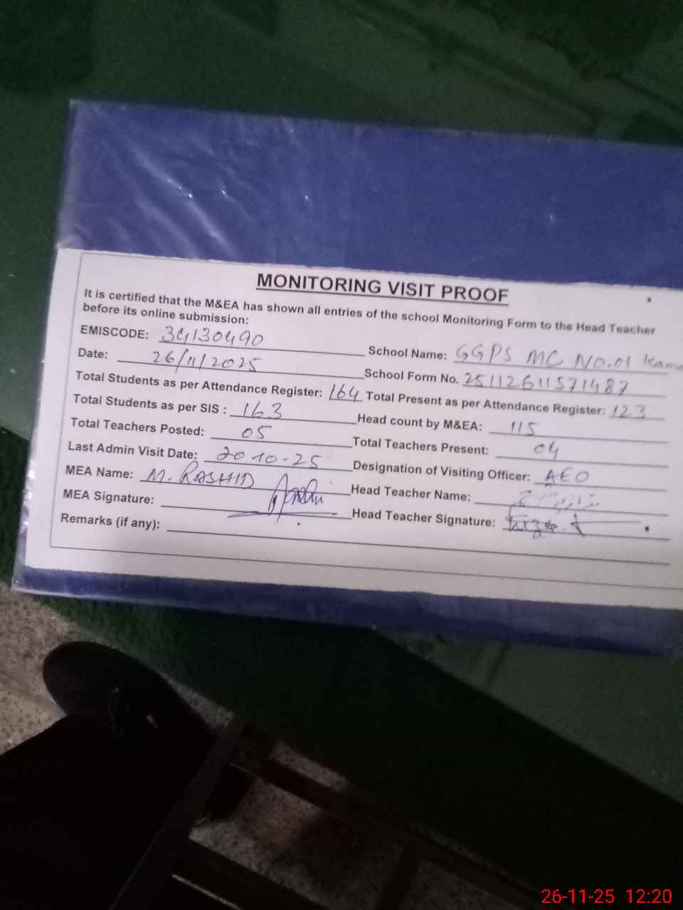 | Attendance Register | Head Teacher | MEA with School | Visit Proof |