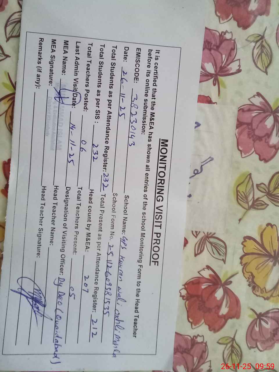 | Remarks (Use Separate Page if Required): Dy DEO visited school on 14 November 2025 Students strength on sis 232 | |||||