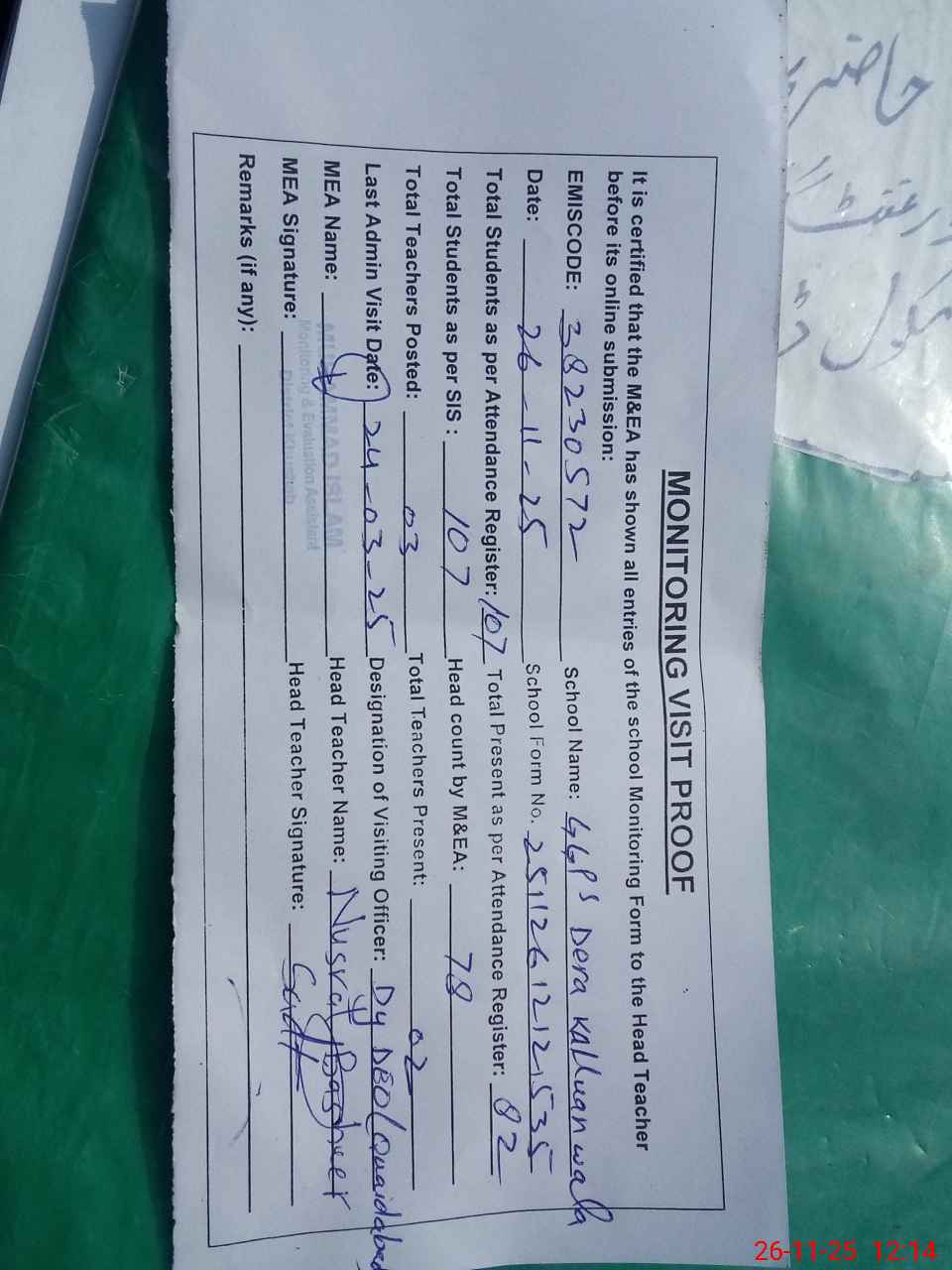 | Remarks (Use Separate Page if Required): Dy DEO visited school on 24 March 2025 Students strength on sis 107 | |||||