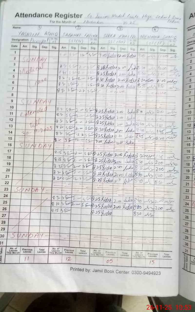| Remarks (Use Separate Page if Required): 02 teachers Nargis and Nasreen on LPR showing on teachers list Teacher Tayyaba transion promotion 08 September 2025 showing on teachers list NQ Usman and SG Abid are absent today 05 teachers on casual leave 02 on medical leave NSB & FTF not maintained and updated No administrative visit during 2025 til now | |||||