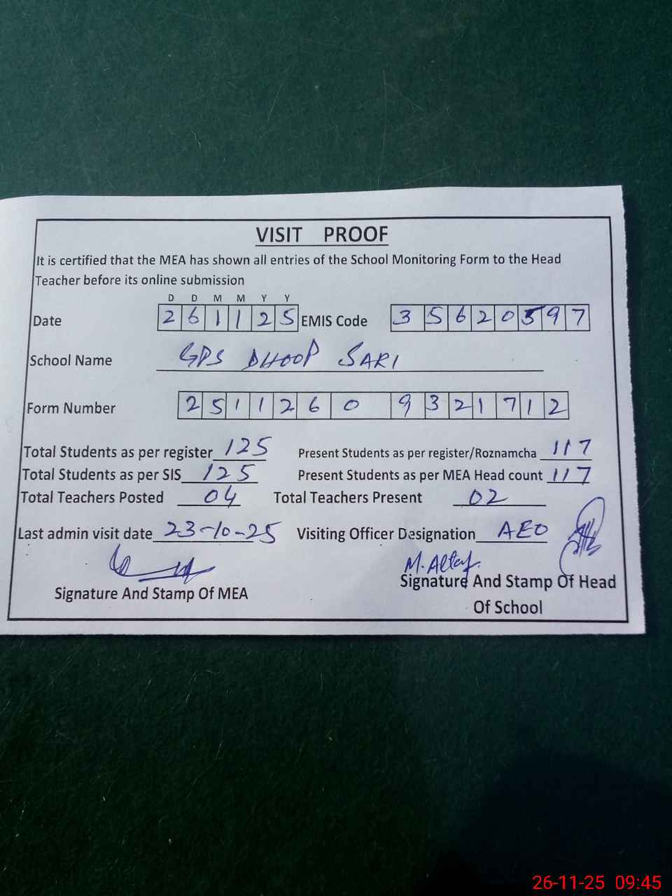 | EMIS Code: 35620597 | Name of School: GPS DHOOP SARI CHAK NO.78 | |||