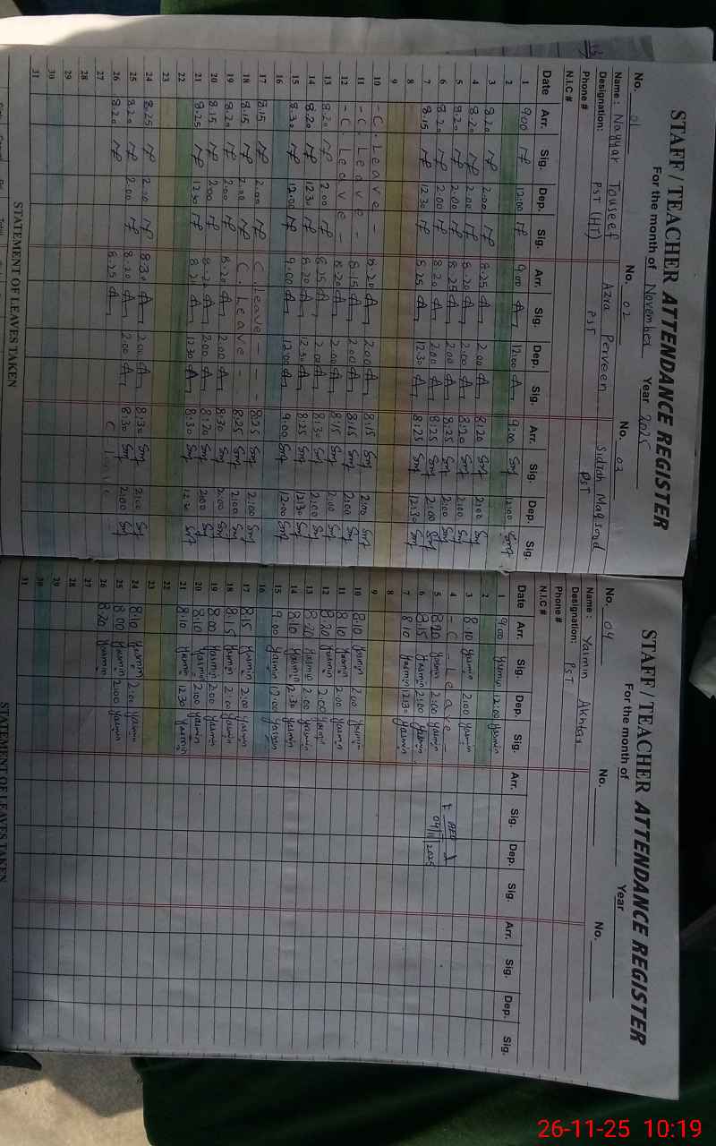 | CNIC | Full Name | Designation | R/C | Absence During Last Calender Month |