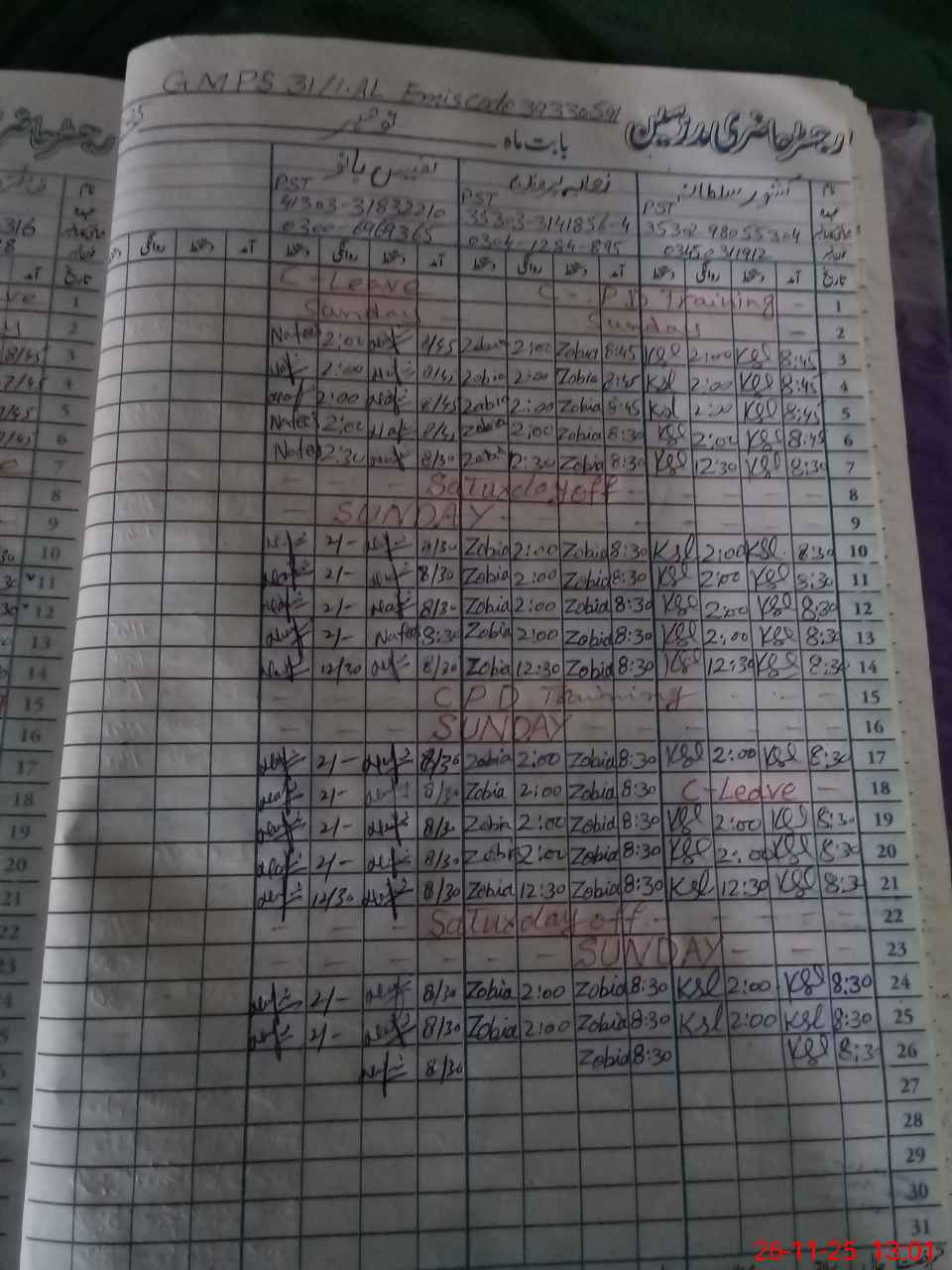 | Leave | Duty | Absent | Maternity | Medical | Ex- Pak |