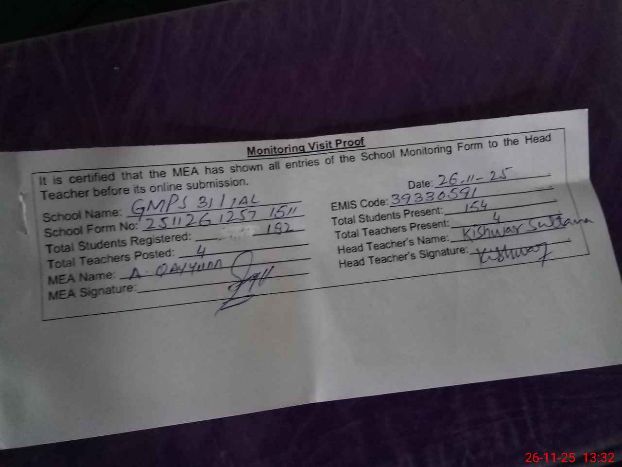 | Attendance Register | Head Teacher | MEA with School | Visit Proof |