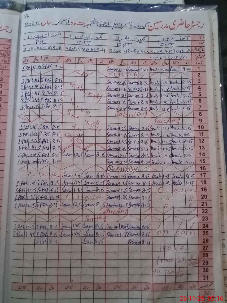 | CNIC | Full Name | Designation | R/C | Absence During Last Calender Month |
