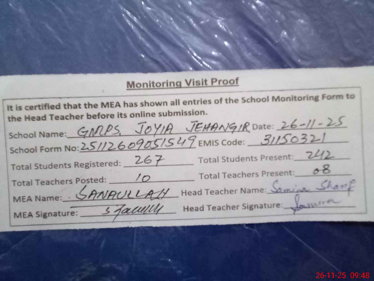| Monitoring Date: 26-11-2025 | Start Time: 26-11-2025 09:05 AM | End Time: 26-11-2025 10:01 AM | Name of MEA: Sa**** | |