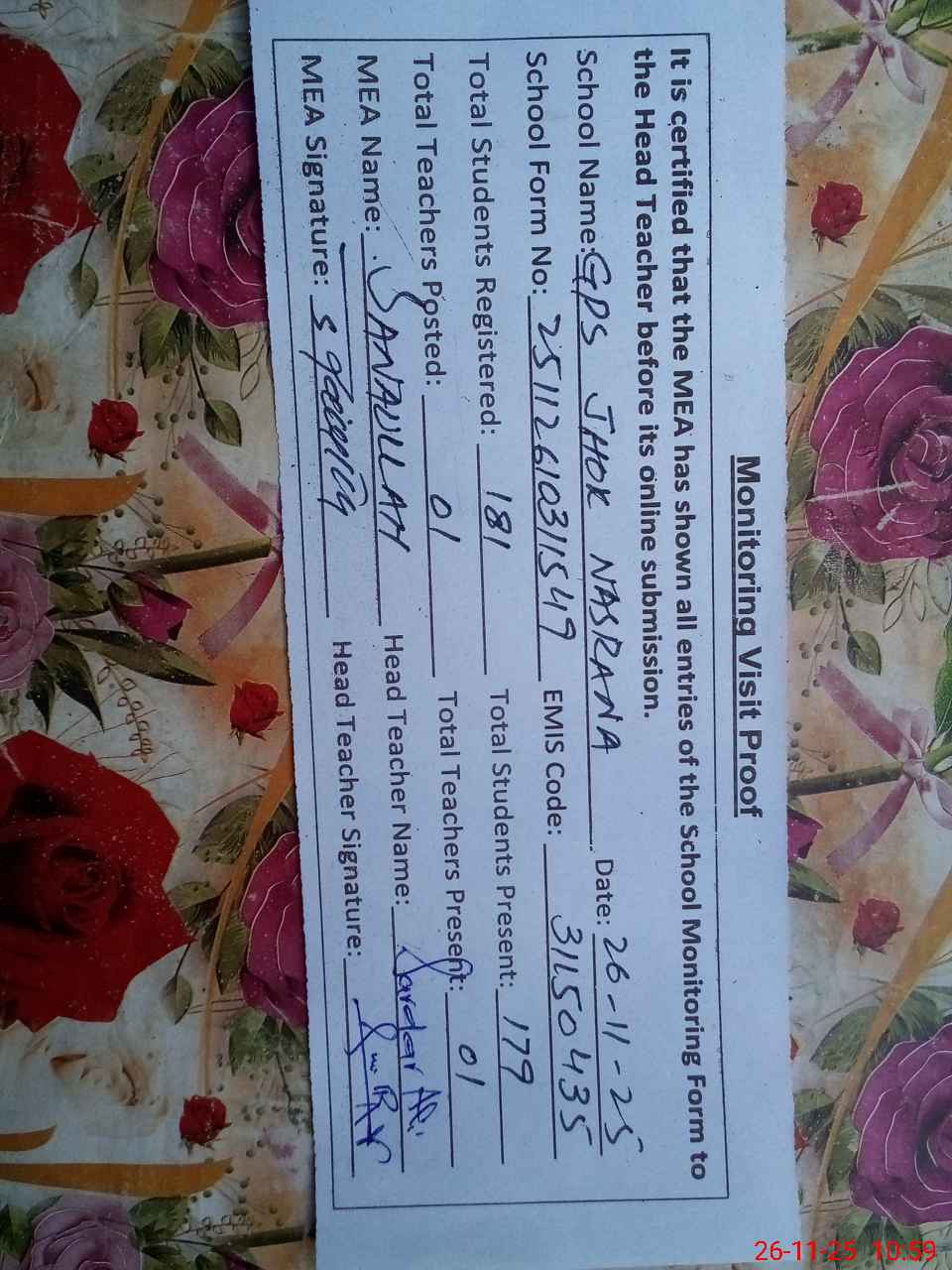 | EMIS Code: 31150435 | Name of School: GPS JHOK NASRANA | |||