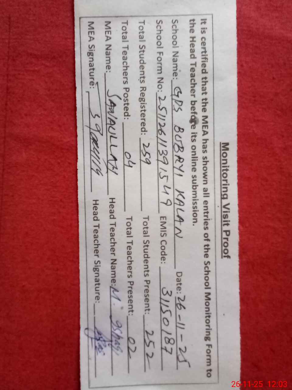 | Attendance Register | Head Teacher | MEA with School | Visit Proof |