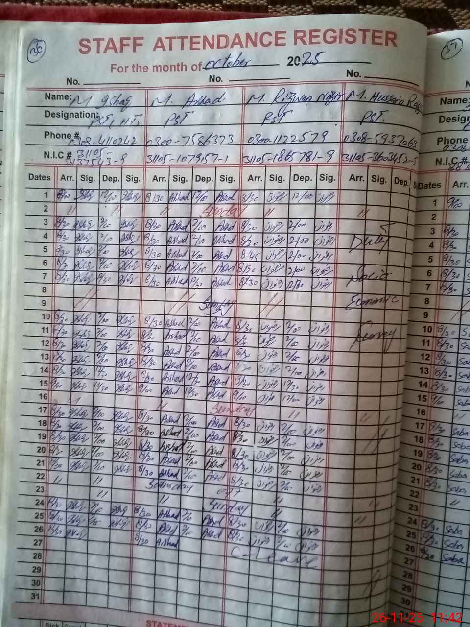 | CNIC | Full Name | Designation | R/C | Absence during last cal. month |