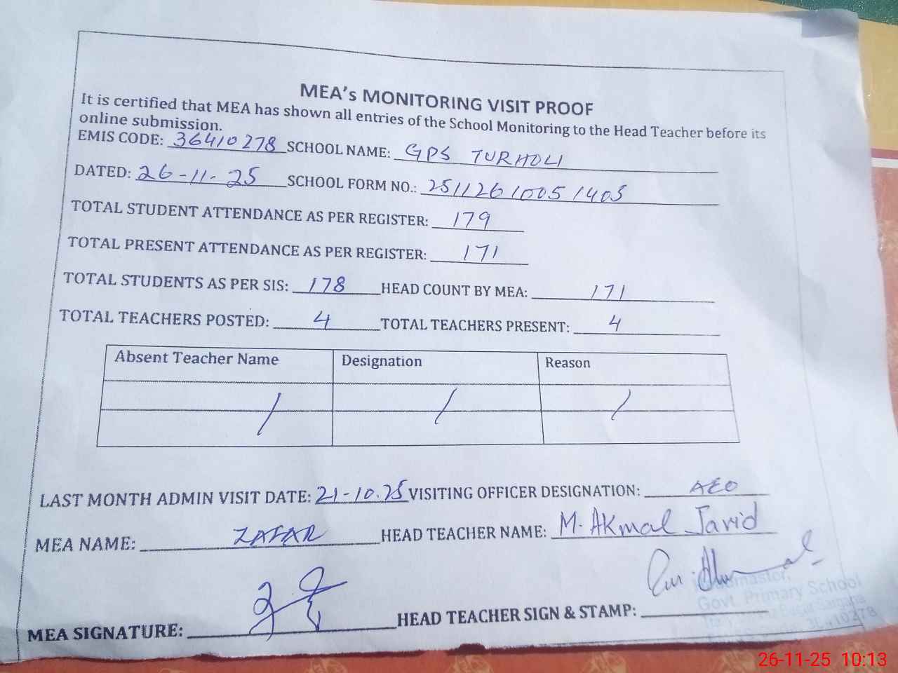| Attendance Register | Head Teacher | MEA with School | Visit Proof |