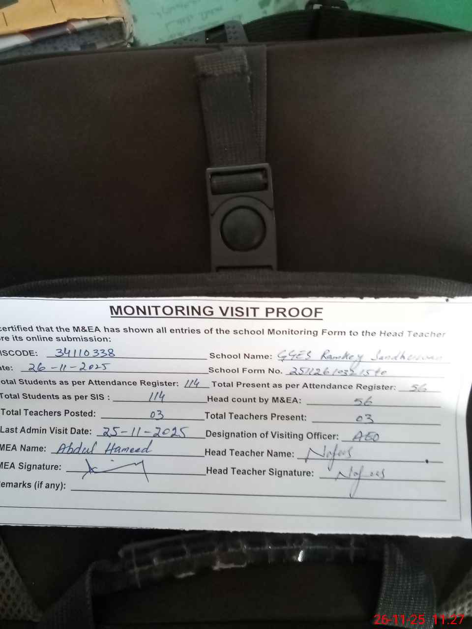 | Attendance Register | Head Teacher | MEA with School | Visit Proof |