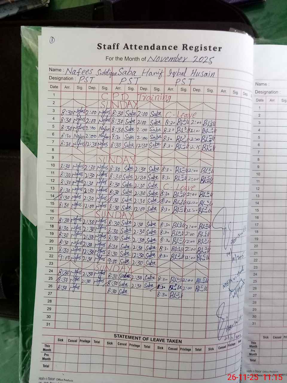 | Leave | Duty | Absent | Maternity | Medical | Ex- Pak |