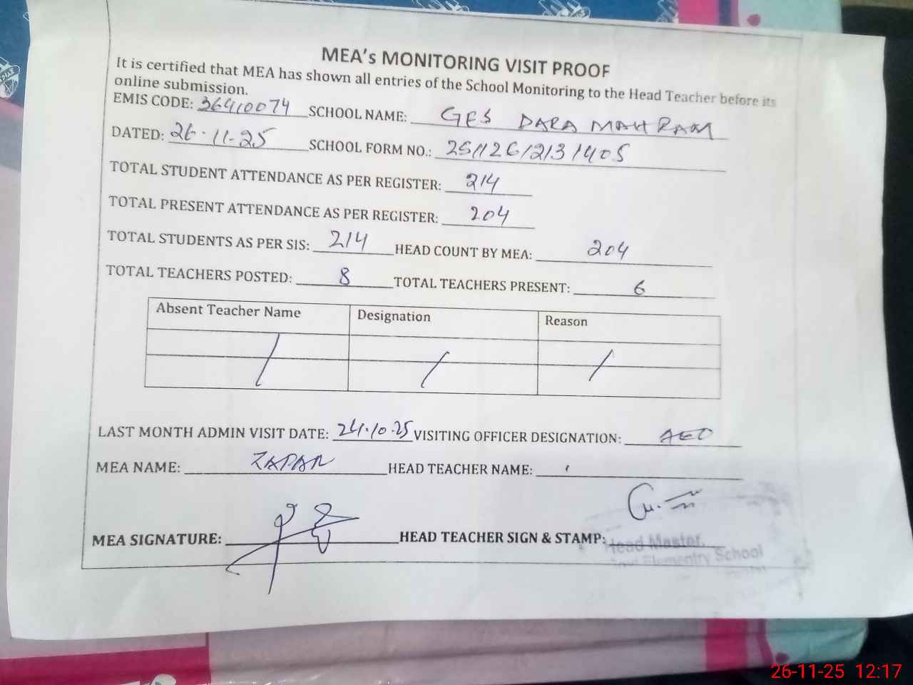| Attendance Register | Head Teacher | MEA with School | Visit Proof |