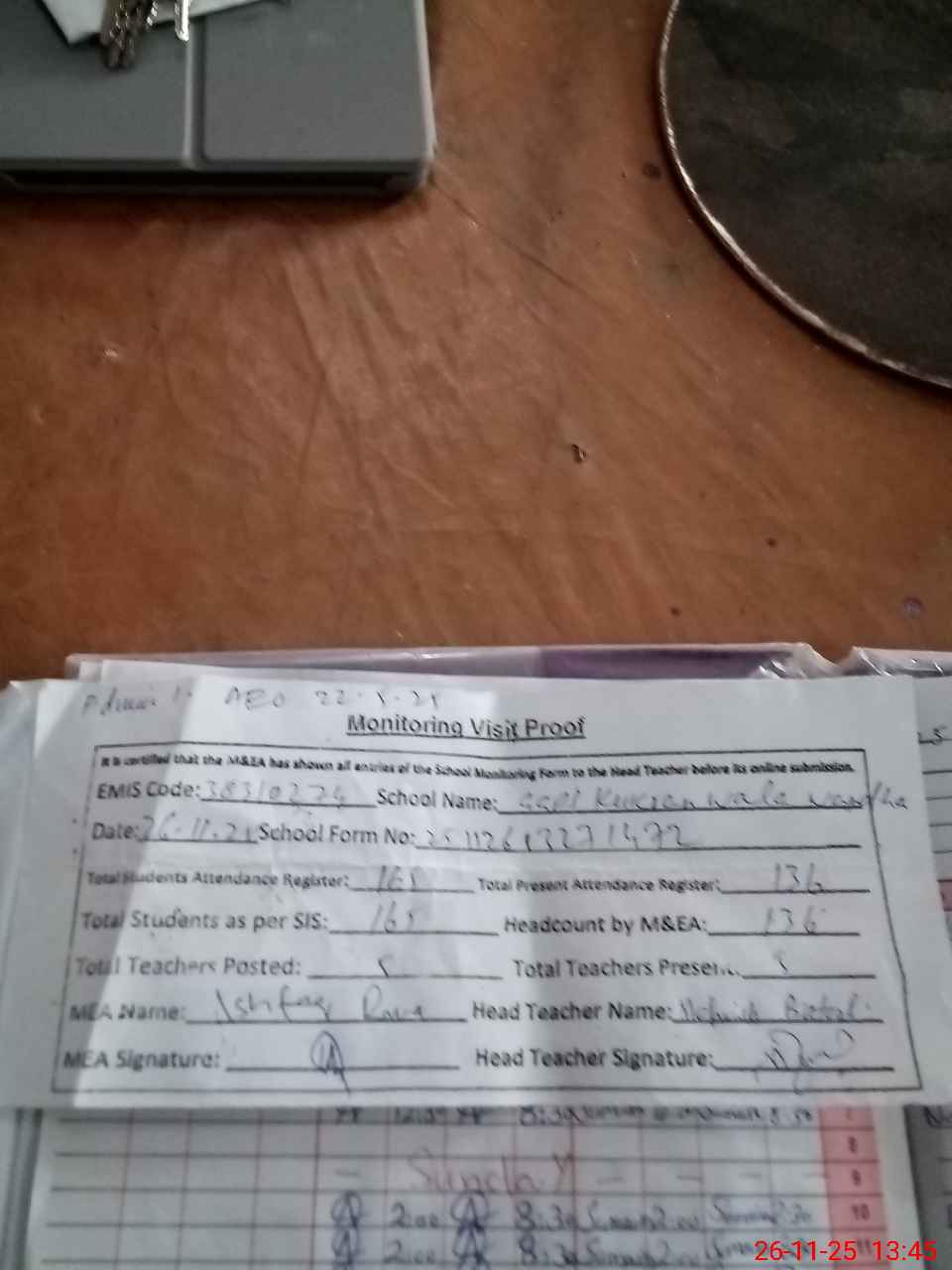| Attendance Register | Head Teacher | MEA with School | Visit Proof |