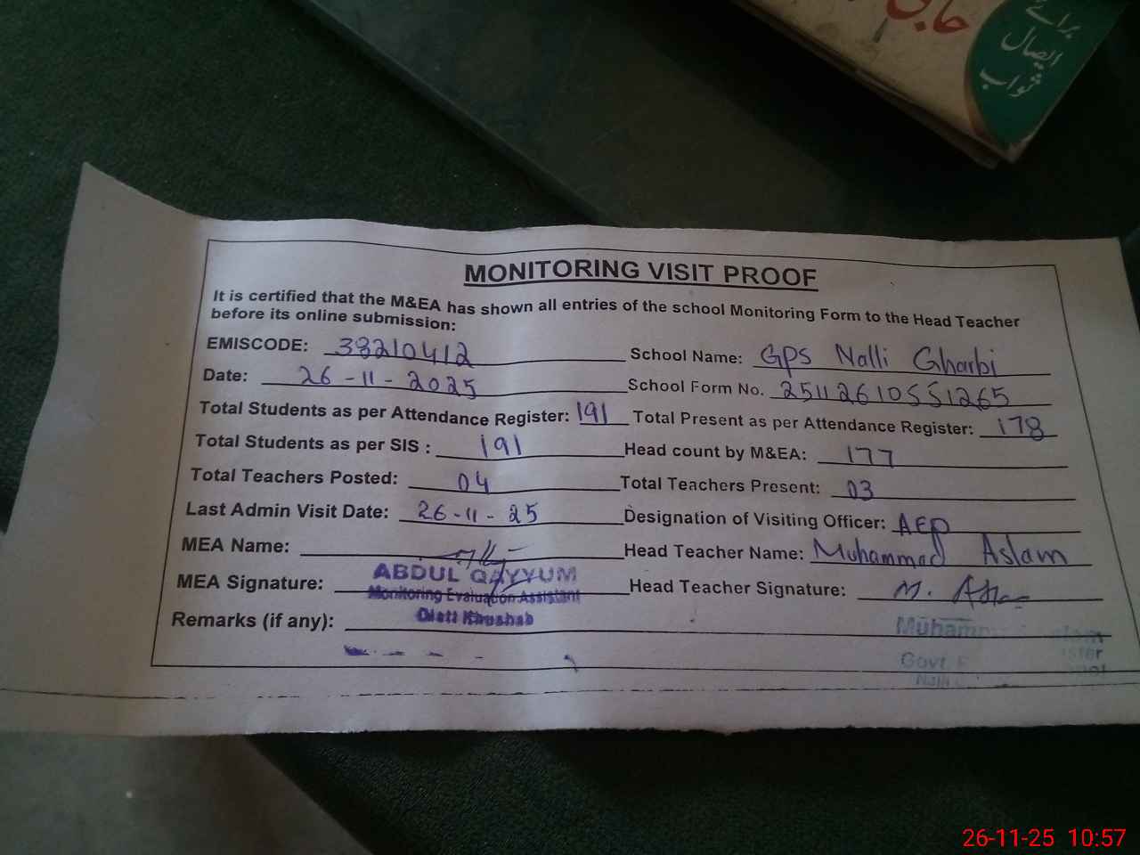 | Remarks (Use Separate Page if Required): last visit by AEO on 26 Nov 2025 | |||||