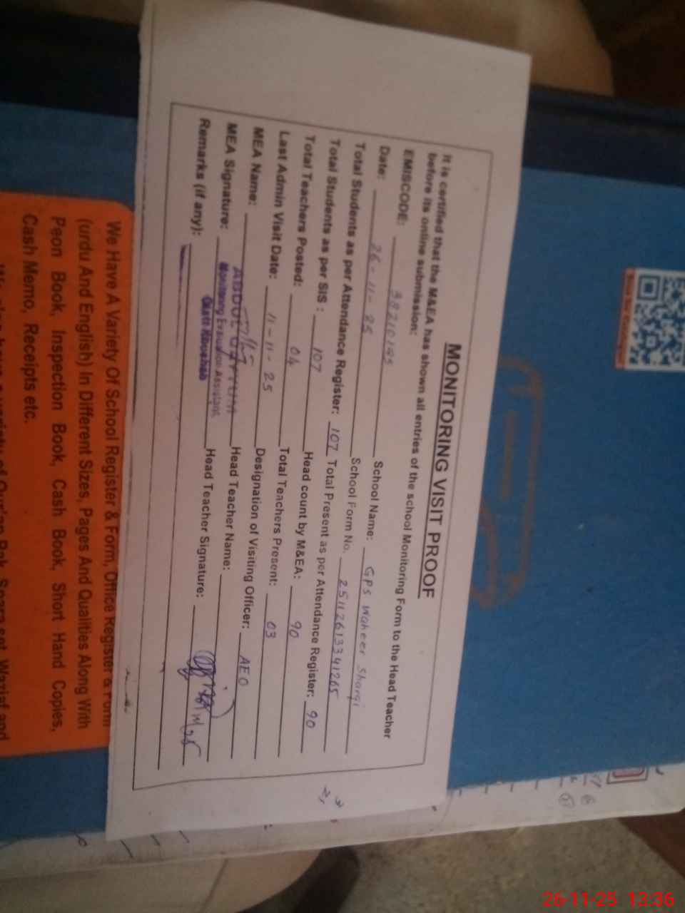 | Attendance Register | Head Teacher | MEA with School | Visit Proof |
