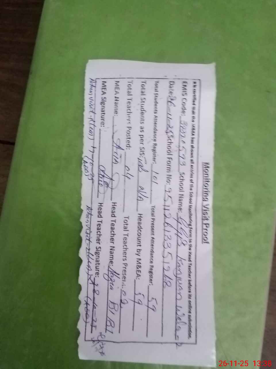 | Attendance Register | Head Teacher | MEA with School | Visit Proof |