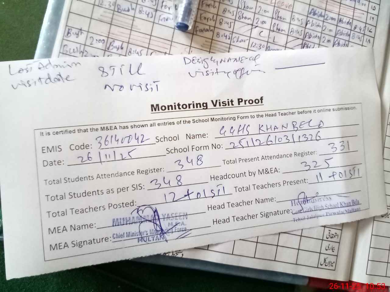 | Attendance Register | Head Teacher | MEA with School | Visit Proof |