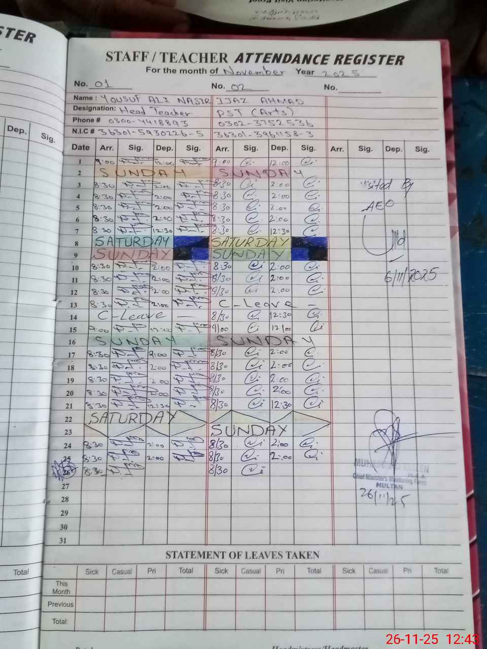 | CNIC | Full Name | Designation | R/C | Absence during last cal. month |