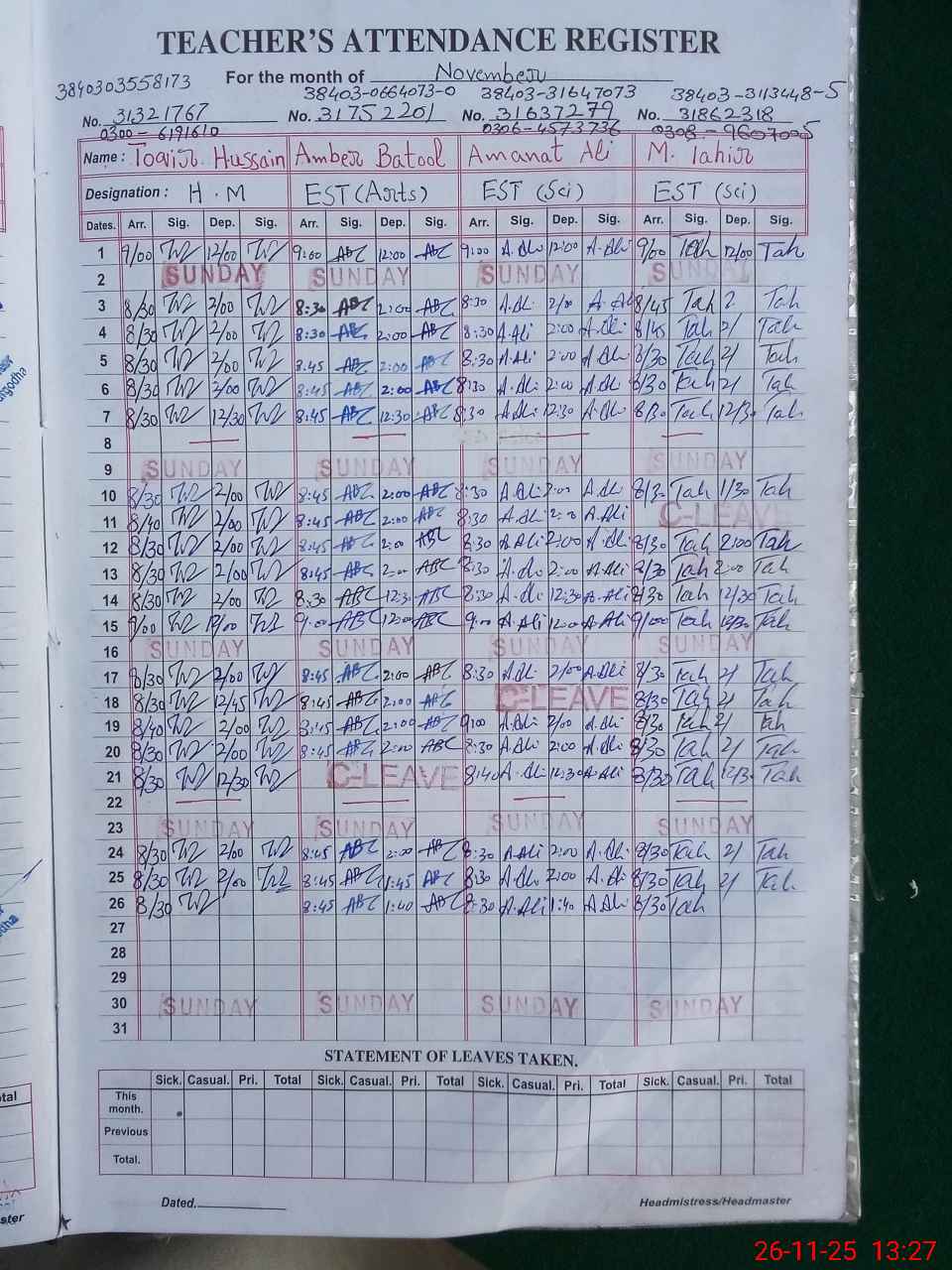 | Name: TO**** HU**** Designation: (School Headmaster's/Headmistress's) EST Phone/Cell Number: 03**** |