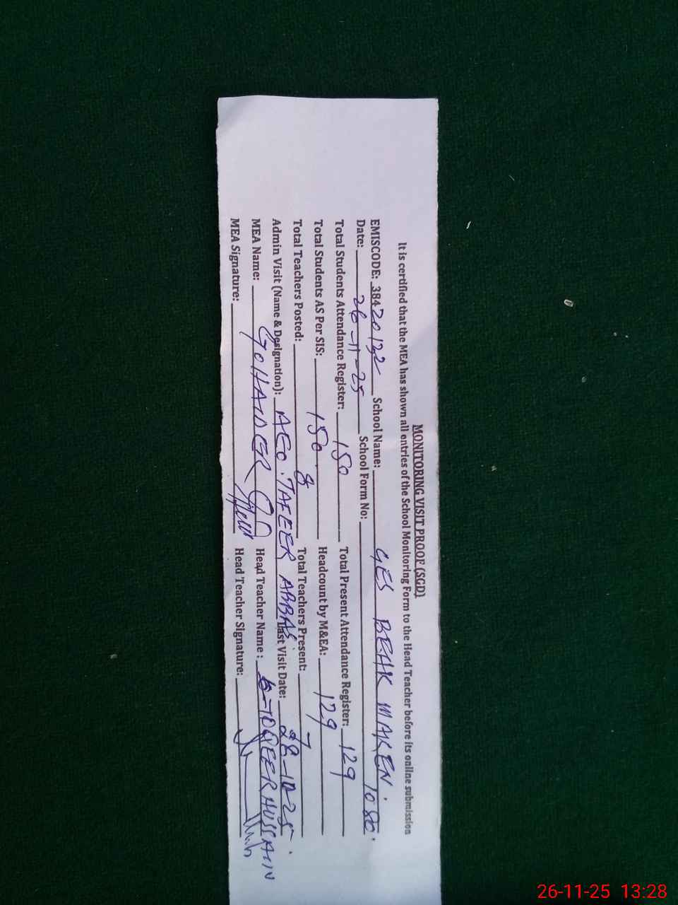 | Attendance Register | Head Teacher | MEA with School | Visit Proof |