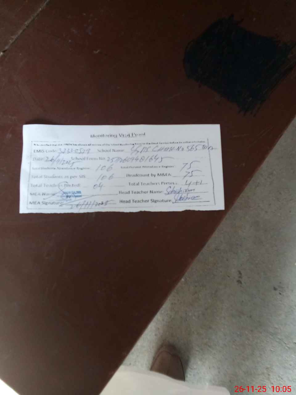 | Attendance Register | Head Teacher | MEA with School | Visit Proof |