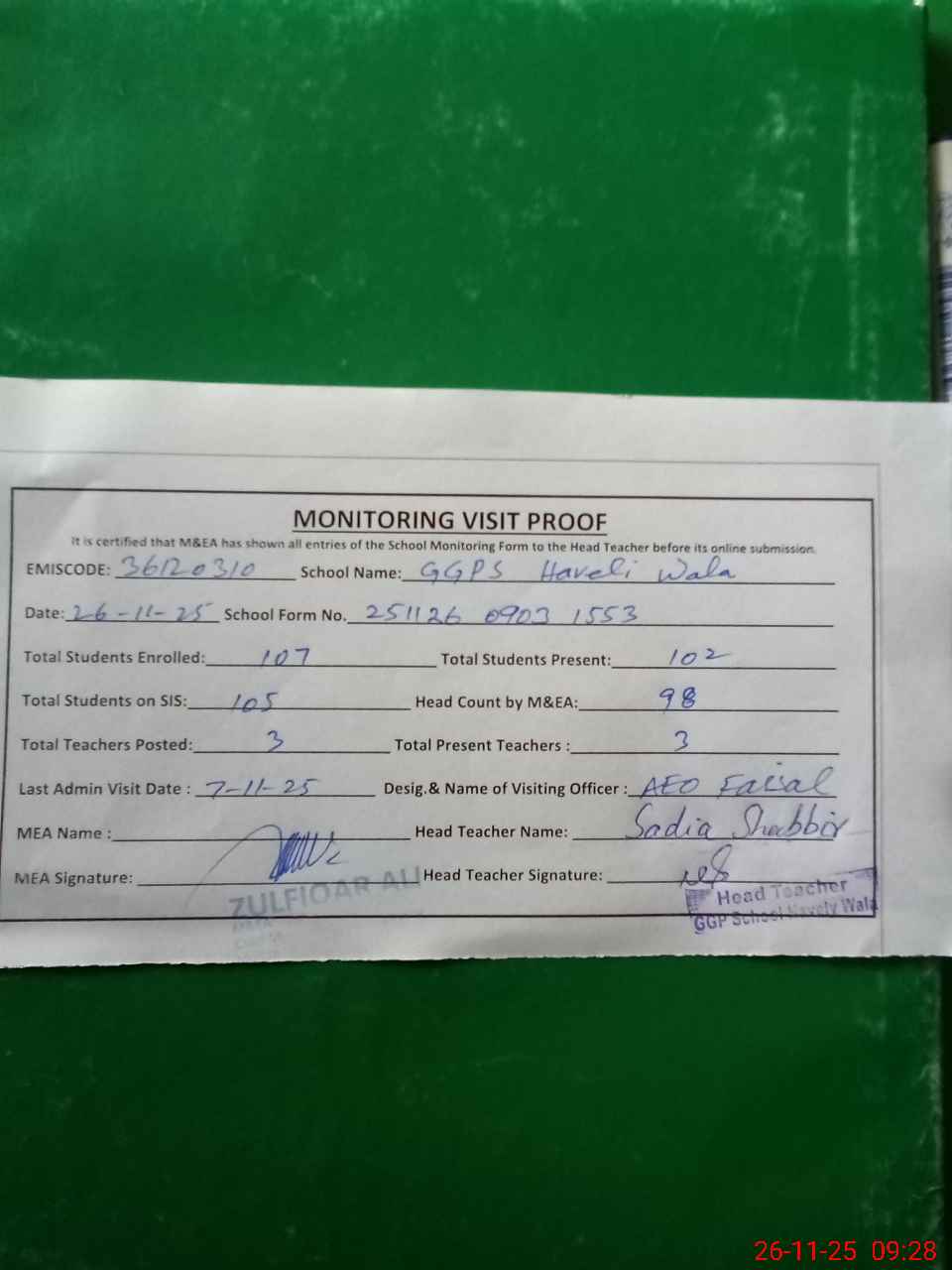| Attendance Register | Head Teacher | MEA with School | Visit Proof |