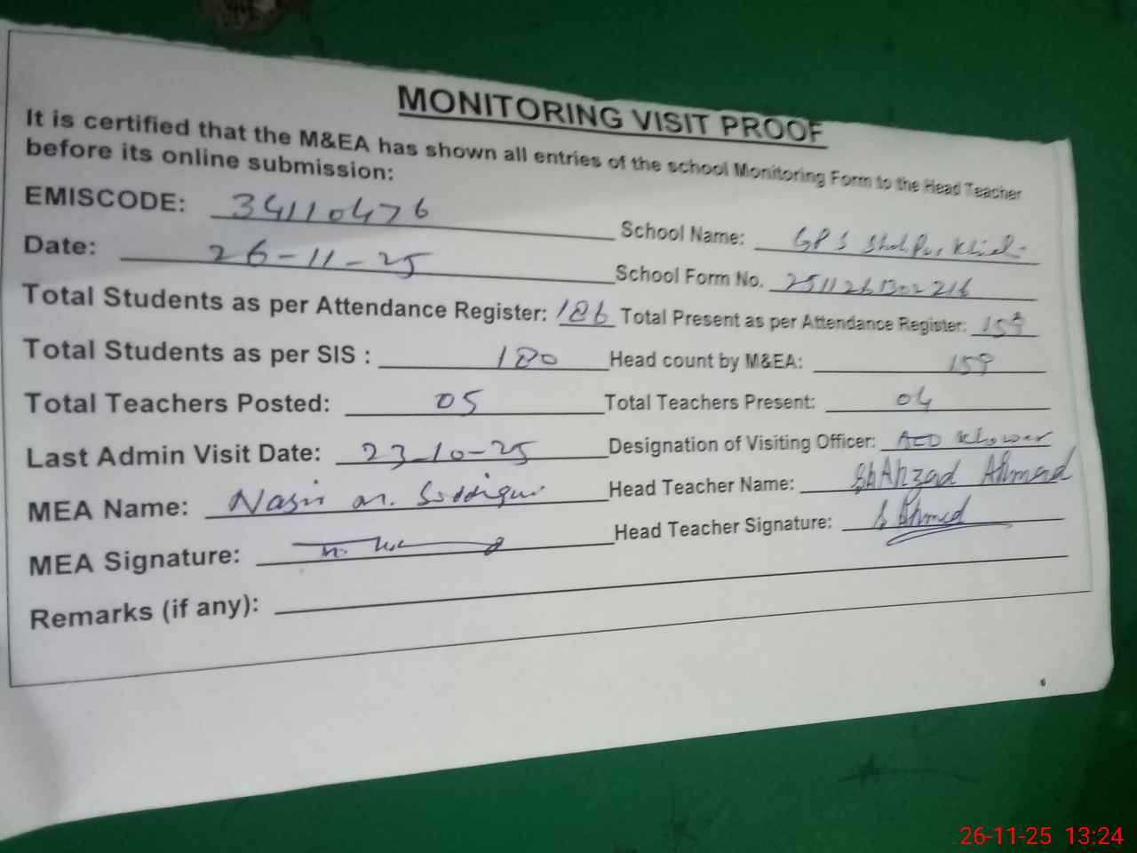 | Attendance Register | Head Teacher | MEA with School | Visit Proof |