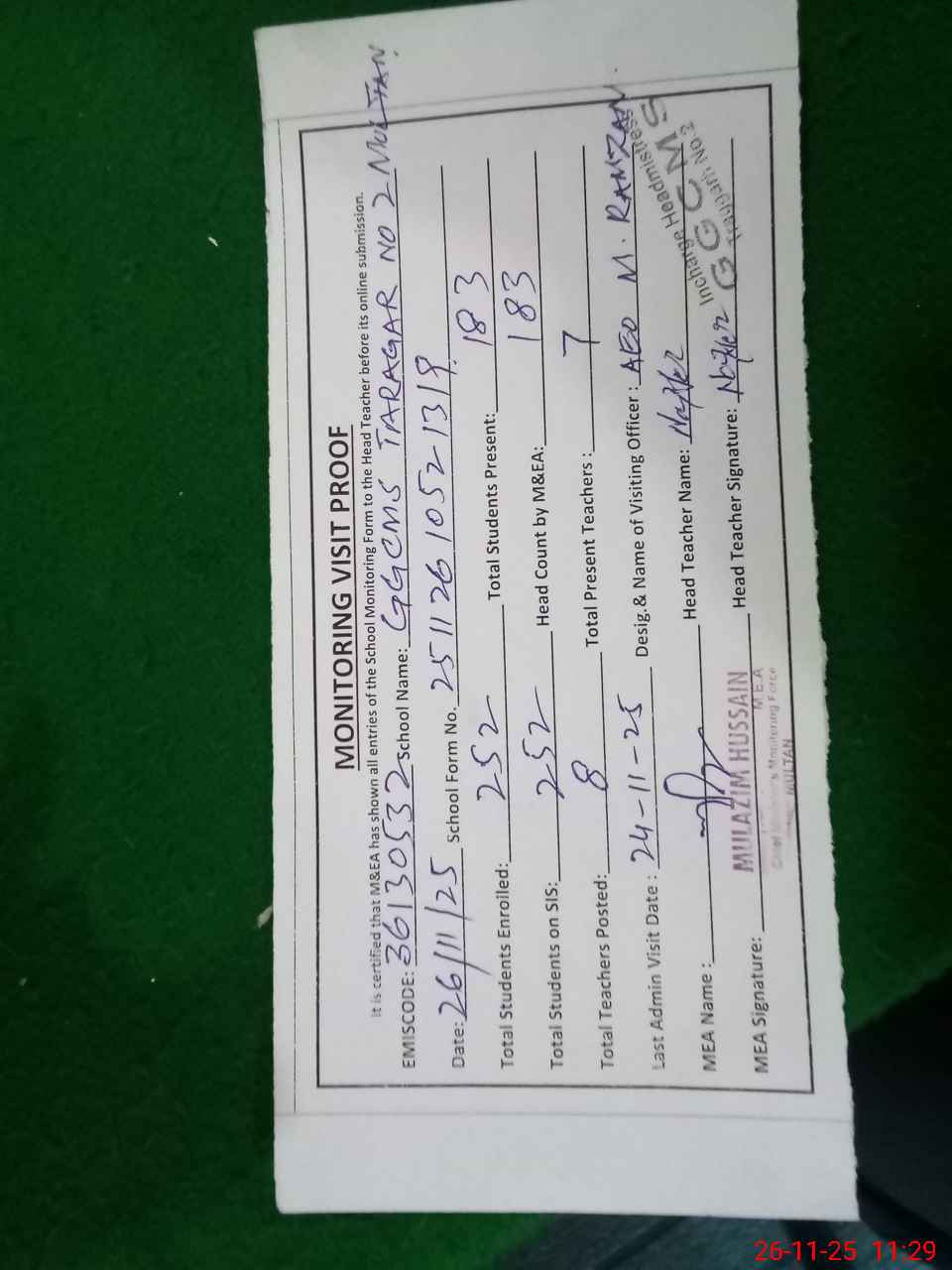 | Attendance Register | Head Teacher | MEA with School | Visit Proof |