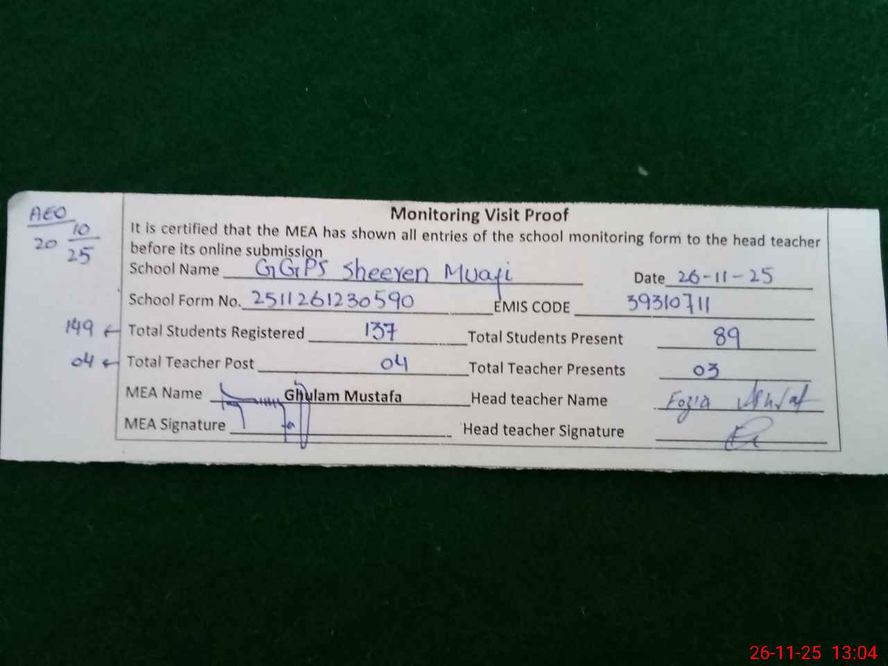 | Attendance Register | Head Teacher | MEA with School | Visit Proof |