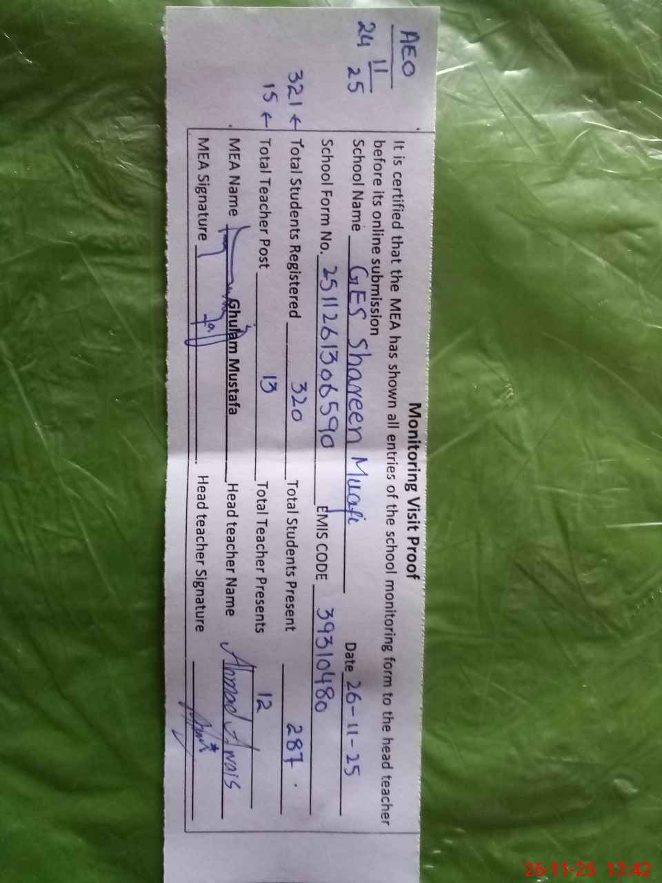 | Attendance Register | Head Teacher | MEA with School | Visit Proof |