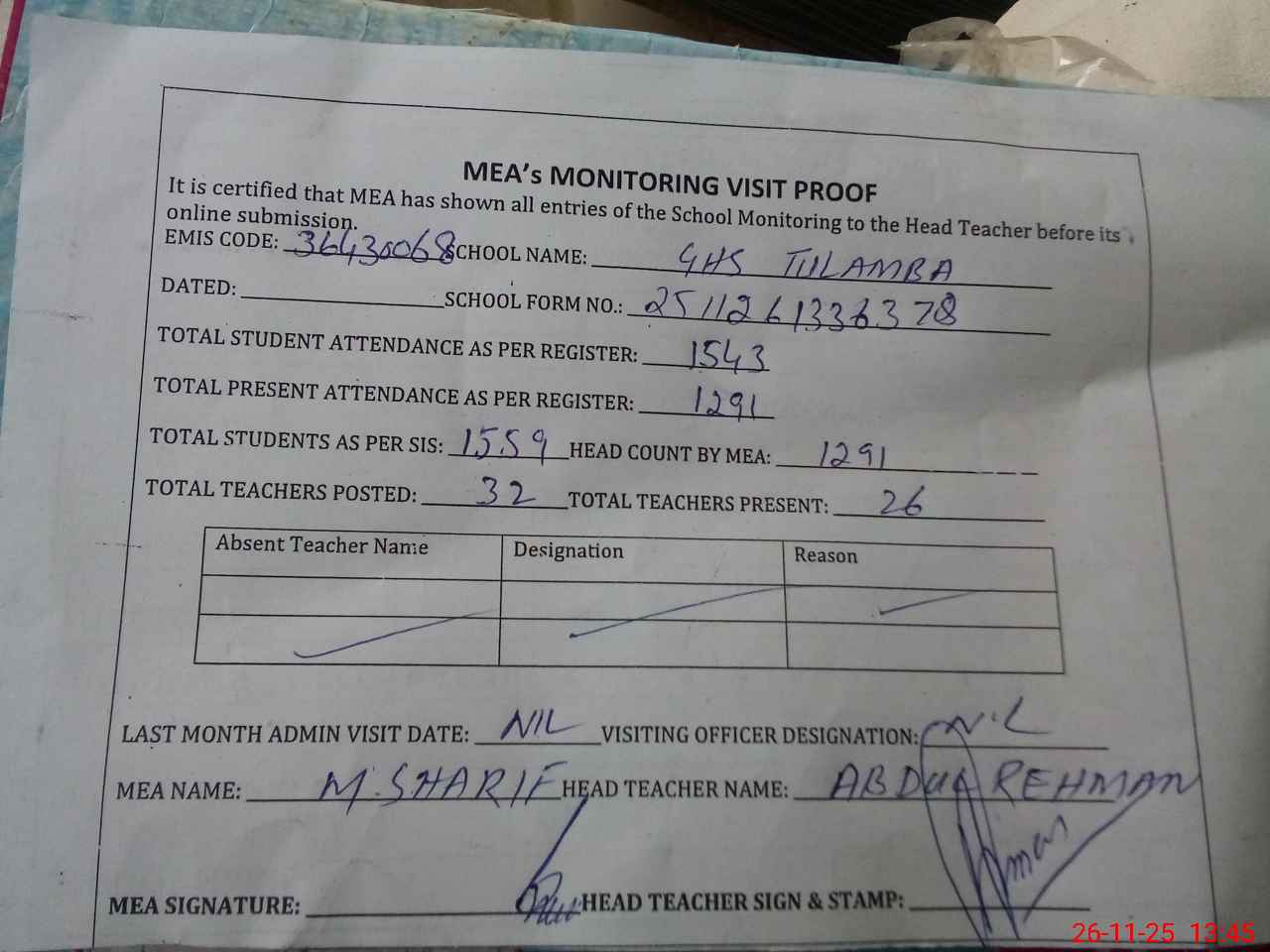 | Attendance Register | Head Teacher | MEA with School | Visit Proof |