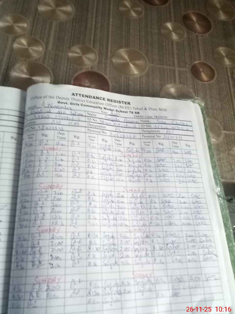 | CNIC | Full Name | Designation | R/C | Absence During Last Calender Month |