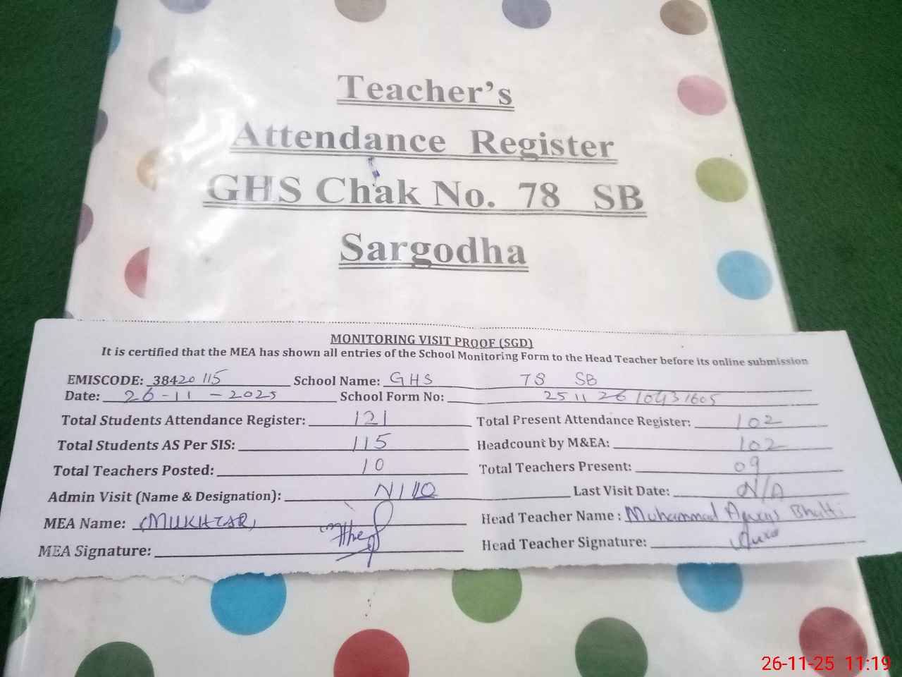 | Attendance Register | Head Teacher | MEA with School | Visit Proof |