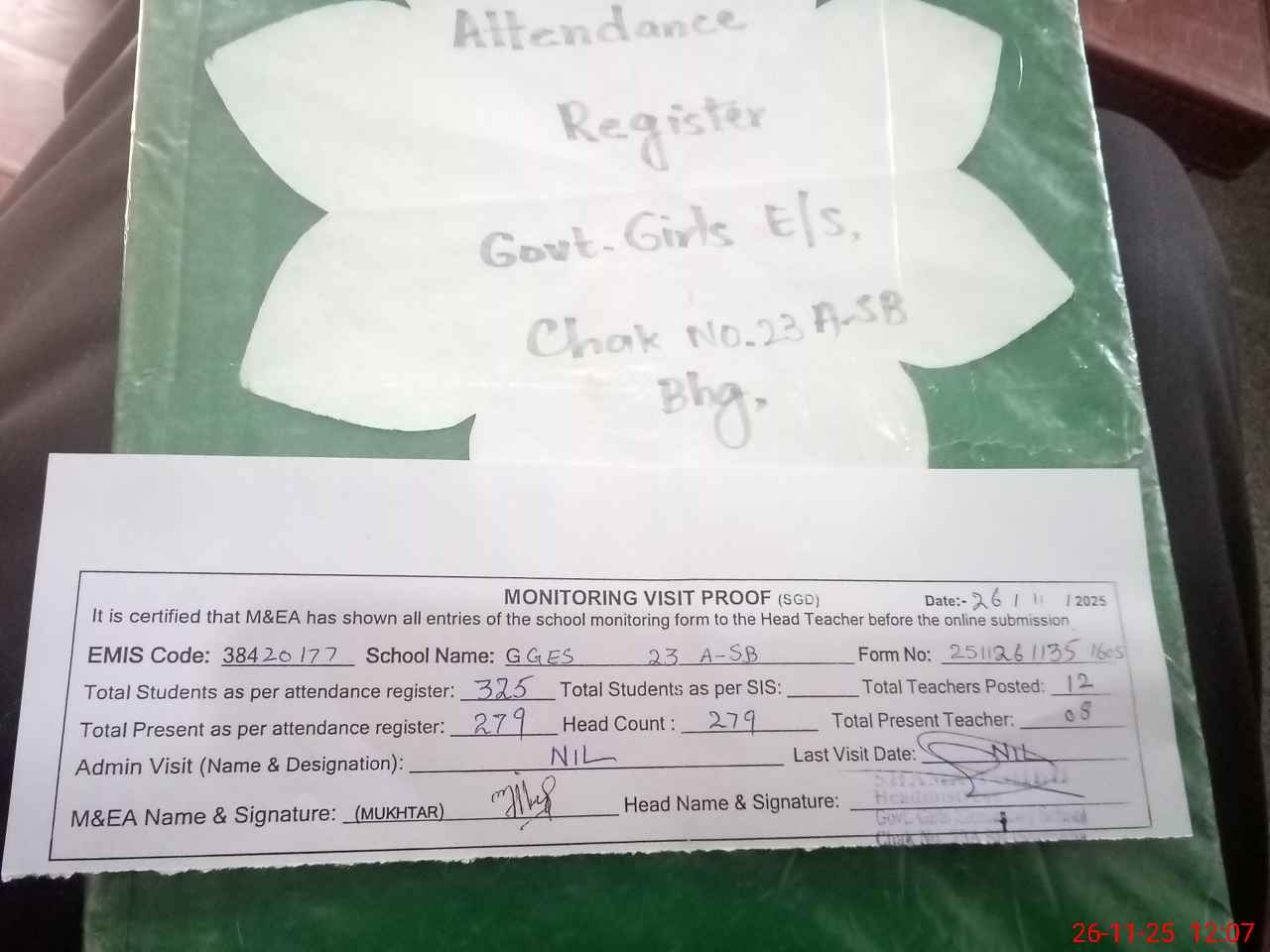 | Attendance Register | Head Teacher | MEA with School | Visit Proof |