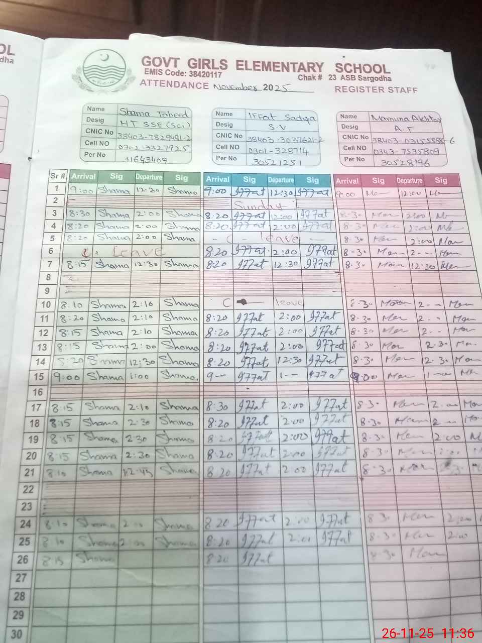 | CNIC | Full Name | Designation | R/C | Absence during last cal. month |