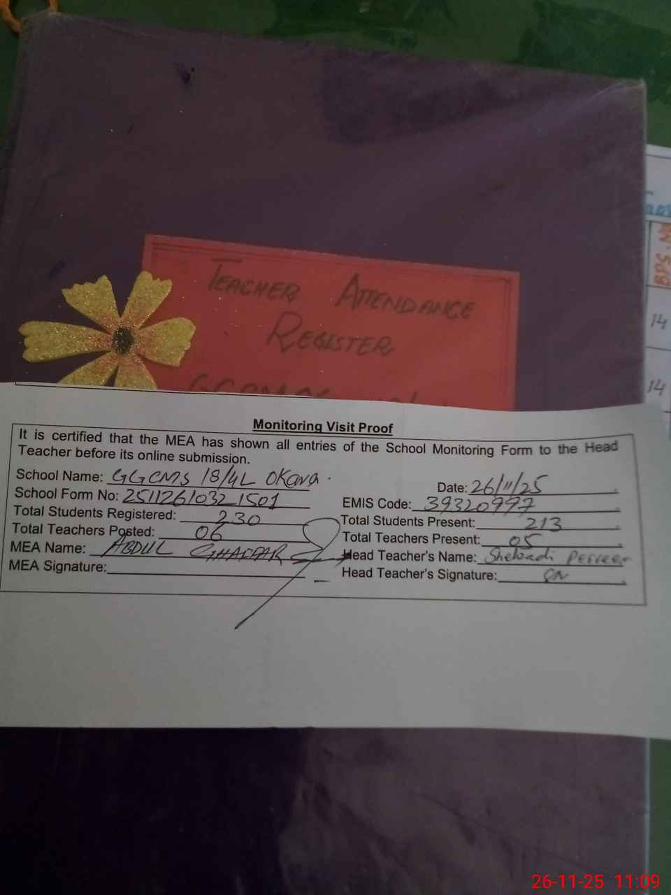 | Attendance Register | Head Teacher | MEA with School | Visit Proof |