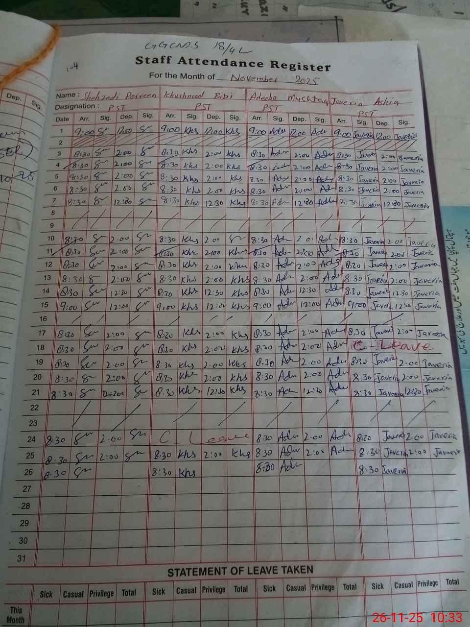 | Leave | Duty | Absent | Maternity | Medical | Ex- Pak |