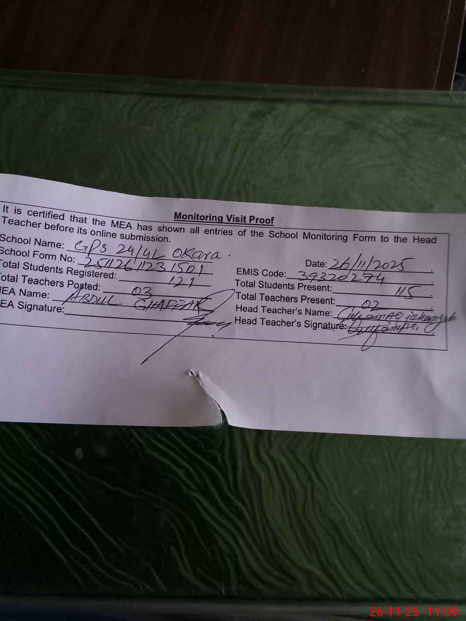 | Attendance Register | Head Teacher | MEA with School | Visit Proof |