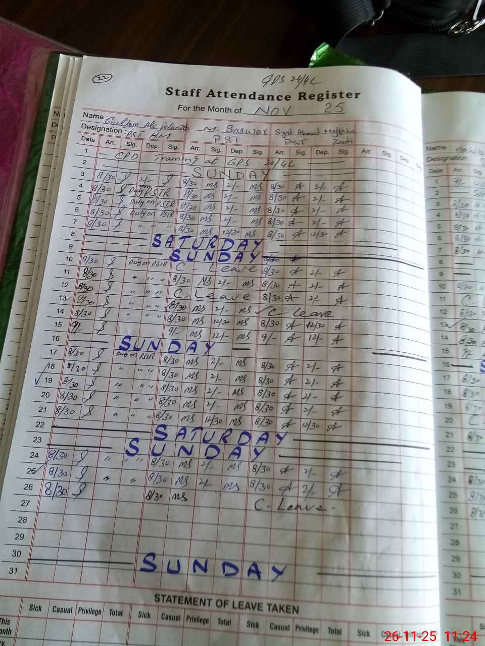 | Leave | Duty | Absent | Maternity | Medical | Ex- Pak |