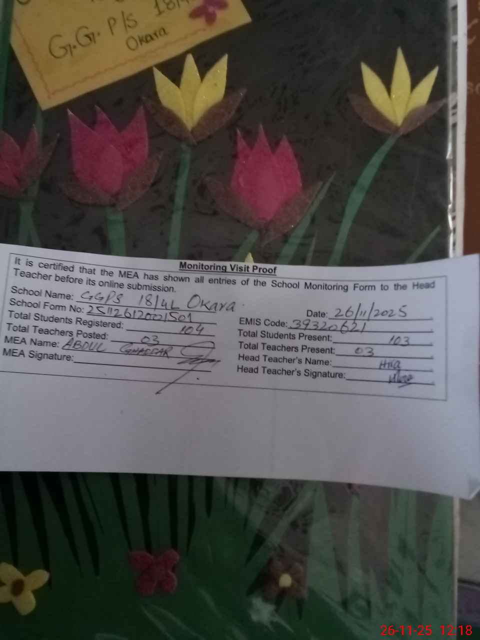 | Attendance Register | Head Teacher | MEA with School | Visit Proof |
